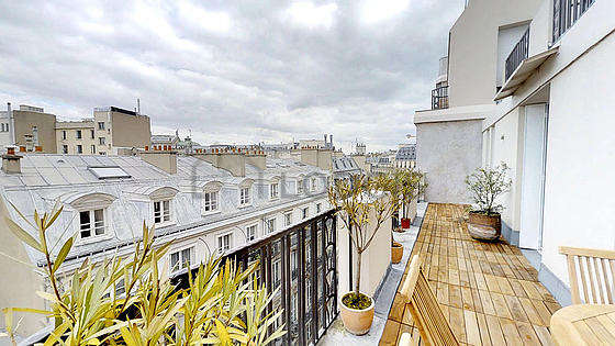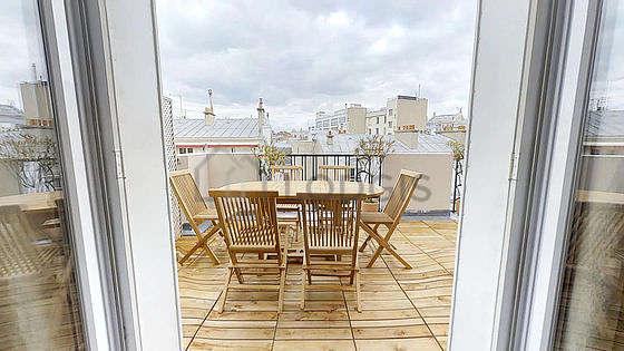View on road, the terrace of this apartment will charm. This quiet and very bright outdoor space furnished with dining table, 5 chair(s) allow you to fully enjoy your Parisian stay, especially in the sunny days.