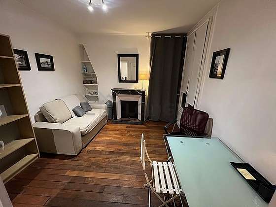 This apartment consists of a living room with wooden floor and its double-glazed windows and view on courtyard. This quiet living room is furnished and equipped for a comfortable stay: linen, quilt, dining table, wardrobe, shelves, 2 chair(s)1 sofabed(s) of 120cm.