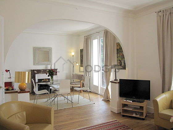 This apartment consists of a charming living room with wooden floor and its windows with balcony and view on road. This quiet living room is furnished and equipped for a comfortable stay: tv, linen, quilt, 3 armchair(s), dining table, coffee table, desk, wardrobe, shelves, cupboard, 4 chair(s)1 sofabed(s) of 140cm.