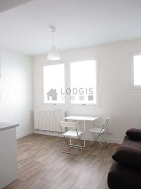 This apartment consists of a living room with wooden floor and its windows and view on courtyard. This quiet living room is furnished and equipped for a comfortable stay: dining table, wardrobe, shelves, cupboard, 2 chair(s)1 sofabed(s) of 140cm.