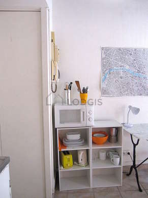 This apartment consists of beautiful kitchen with tile floor and all the necessary equipment for your daily life: hob, refrigerator, microwave oven, freezer, toaster, kettle, coffee-maker, shelves, cupboard, crockery.