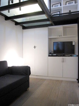 This apartment consists of a charming living room with wooden floor and its double-glazed windows and view on courtyard. This very quiet living room is furnished and equipped for a comfortable stay: tv, linen, quilt, coffee table, wardrobe, cupboard1 sofabed(s) of 130cm.