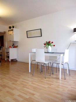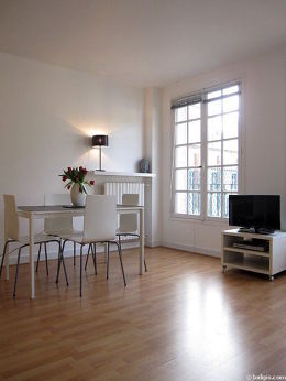 This apartment consists of a attractive living room with wooden floor and its windows and view on courtyard. This very quiet living room is furnished and equipped for a comfortable stay: tv, linen, quilt, 1 armchair(s), dining table, coffee table, wardrobe, shelves, cupboard, 4 chair(s)1 sofabed(s) of 80cm, 1 murphy bed(s) of 140cm.
