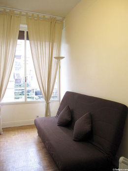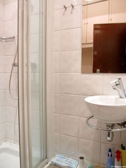This apartment consists of a living room with wooden floor and its windows and view on garden. This quiet living room is furnished and equipped for a comfortable stay: coffee table, desk, wardrobe, shelves, cupboard, 1 chair(s)1 sofabed(s) of 140cm.