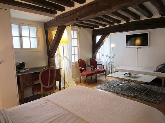 This apartment consists of a wonderful living room with wooden floor and its windows and view on courtyard. This very quiet living room is furnished and equipped for a comfortable stay: tv, linen, quilt, 3 armchair(s), dining table, coffee table, desk, wardrobe, shelves, cupboard, bedside table1 sofabed(s) of 90cm, 1 bed(s) of 140cm.