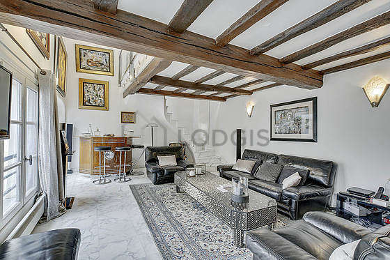 This duplex consists of a fabulous living room with marble floor and its double-glazed windows and view on courtyard. This very quiet living room is furnished and equipped for a comfortable stay: tv, sofa, 2 armchair(s), coffee table, wardrobe, closet, bar.