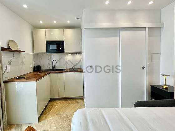 This apartment consists of kitchen with tile floor and all the essential equipment for your daily life: hob, refrigerator, microwave oven, freezer, extractor hood, toaster, kettle, coffee-maker, cupboard, crockery.