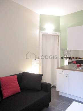 This apartment consists of a pleasant living room with tile floor and its windows and view on courtyard. This very quiet living room is furnished and equipped for a comfortable stay: linen, quilt, dining table, cupboard, 2 chair(s)1 sofabed(s) of 140cm.