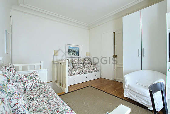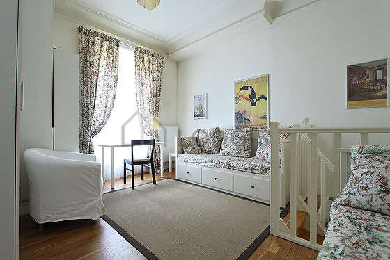 This duplex consists of a attractive living room with wooden floor and its windows and view on courtyard. This very quiet living room is furnished and equipped for a comfortable stay: tv, linen, quilt, 1 armchair(s), desk, wardrobe, shelves, closet, 1 chair(s)1 sofabed(s) of 80cm, 1 bed(s) of 160cm.