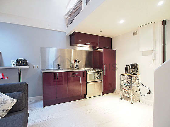 This duplex consists of beautiful kitchen close to the living room with wooden floor and all the essential equipment for your daily life: hob, refrigerator, oven, microwave oven, freezer, toaster, kettle, coffee-maker, cupboard, crockery.