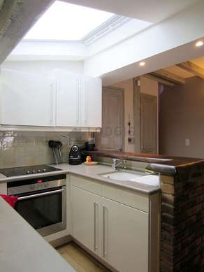 This apartment consists of beautiful kitchen with wooden floor and all the necessary equipment for your daily life: hob, refrigerator, freezer, oven, microwave oven, extractor hood, toaster, kettle, coffee-maker, shelves, cupboard, crockery.