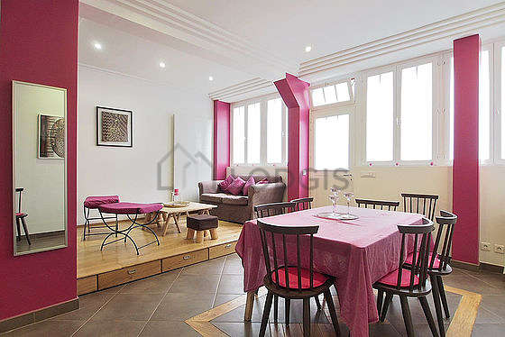 This duplex consists of a beautiful living room with wooden floor and its double-glazed windows and view on road. This very quiet living room is furnished and equipped for a comfortable stay: tv, linen, quilt, 2 armchair(s), dining table, coffee table, cupboard, 6 chair(s)1 sofabed(s) of 120cm.