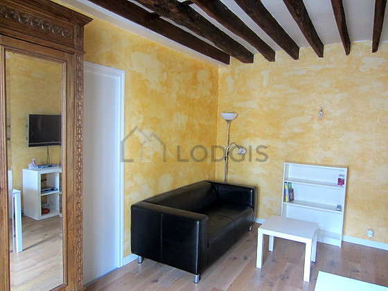 Living roomThis apartment consists of a pleasant living room with wooden floor and its double-glazed windows and view on road. This quiet living room is furnished and equipped for a comfortable stay: tv, sofa, dining table, coffee table, closet.