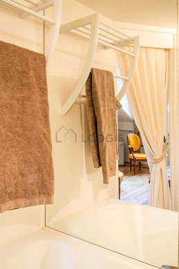 This apartment is equipped with a bathroom bright. This bathroom is furnished with all the equipment you need for a comfortable stay: bath towels, shelves, cupboard, bath tub, hair-dryer. The toilets are separated from the bathroom and located in an independant room.