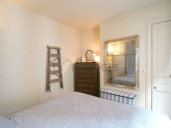 This apartment consists of a charming living room with wooden floor and its double-glazed windows and view on courtyard. This quiet living room is furnished and equipped for a comfortable stay: tv, sofa, dining table, desk, storage space, 3 chair(s).