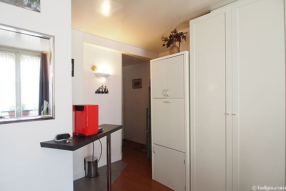 This apartment consists of a pleasant living room with wooden floor and its double-glazed windows and view on road. This quiet living room is furnished and equipped for a comfortable stay: linen, quilt, dining table, coffee table, wardrobe, storage space, cupboard, 3 chair(s), stool1 sofabed(s) of 140cm.