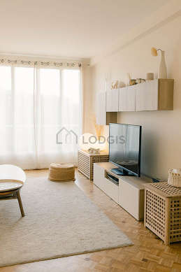 This apartment consists of a charming living room with wooden floor and its double-glazed windows. This quiet living room is furnished and equipped for a comfortable stay: tv, sofa, coffee table, wardrobe, cupboard, 1 chair(s).