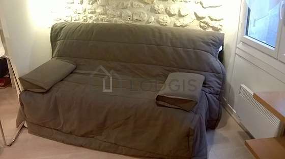Living roomThis apartment consists of a living room with tile floor and its windows and view on courtyard. This very quiet living room is furnished and equipped for a comfortable stay: tv, linen, quilt, dining table, coffee table, wardrobe, bookcase, shelves, cupboard, 2 chair(s)1 sofabed(s) of 160cm.