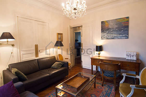 This apartment consists of a living room its double-glazed windows and view on courtyard. This living room is furnished and equipped for a comfortable stay: tv, sofa, dining table, shelves, sideboard, fireplace, 1 chair(s).