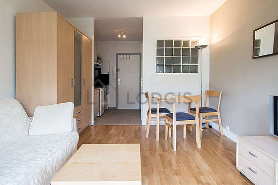 This apartment consists of a pleasant living room with wooden floor and its double-glazed windows with balcony and view on road. This quiet living room is furnished and equipped for a comfortable stay: tv, linen, quilt, 1 armchair(s), dining table, coffee table, wardrobe, shelves, closet, 4 chair(s)1 sofabed(s) of 140cm.