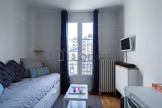 This apartment consists of a charming living room with wooden floor and its double-glazed windows and view on road. This quiet living room is furnished and equipped for a comfortable stay: tv, linen, quilt, coffee table, desk, wardrobe, shelves, cupboard, 1 chair(s), stool1 pullout bed(s) of 90cm.
