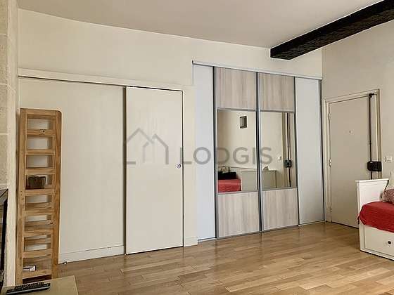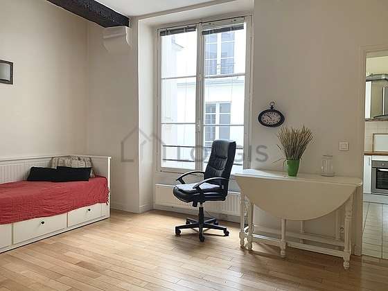 This apartment consists of a charming living room with wooden floor and its windows and view on courtyard. This quiet living room is furnished and equipped for a comfortable stay: tv, linen, quilt, 1 armchair(s), dining table, coffee table, wardrobe, shelves, cupboard, 1 chair(s)2 bed(s) of 80cm.