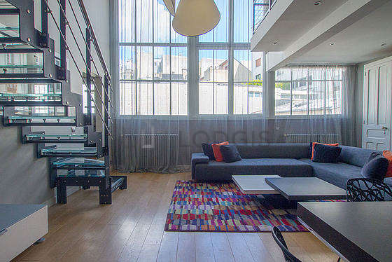 Living roomThis duplex consists of a fabulous living room with wooden floor and its double-glazed windows and view on courtyard. This very quiet living room is furnished and equipped for a comfortable stay: sofa, dining table, coffee table, wardrobe, shelves, cupboard, 6 chair(s).