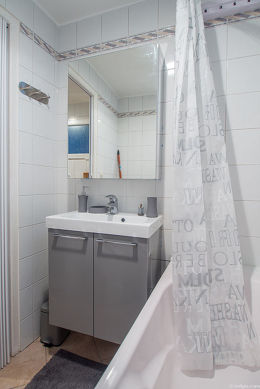 This apartment consists of great kitchen with tile floor and all the necessary equipment for your daily life: hob, refrigerator, combined microwave oven, freezer, kettle, shelves, cupboard, crockery.
