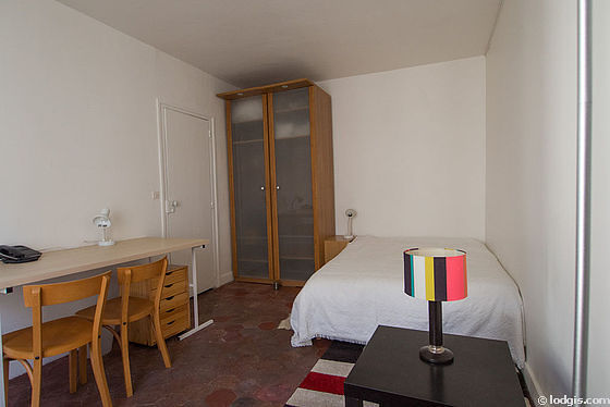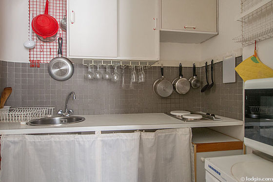 This apartment consists of a charming living room with a floor tiles floor and its windows and view on courtyard. This very quiet living room is furnished and equipped for a comfortable stay: tv, dining table, coffee table, bookcase1 sofabed(s) of 90cm.