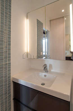 This apartment consists of a pleasant living room with wooden floor and its double-glazed windows and view on courtyard. This very quiet living room is furnished and equipped for a comfortable stay: tv, sofa, wardrobe, shelves, cupboard, 2 chair(s).