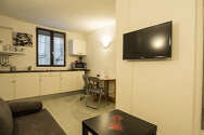 This apartment consists of beautiful kitchen close to the living room with linoleum floor and all the necessary equipment for your daily life: hob, refrigerator, combined microwave oven, freezer, toaster, coffee-maker, shelves, cupboard, crockery.