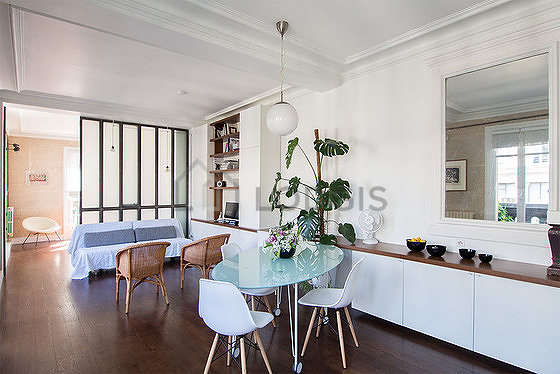This apartment consists of a beautiful living room with wooden floor and its windows with balcony and view on road. This living room is furnished and equipped for a comfortable stay: tv, 2 armchair(s), dining table, desk, shelves, cupboard, 4 chair(s), stool1 sofabed(s) of 180cm.