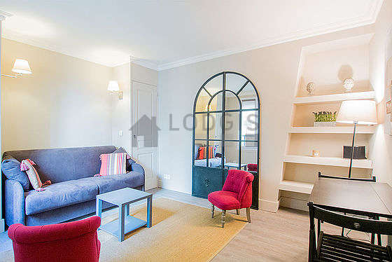 This apartment consists of a attractive living room with wooden floor and its double-glazed windows and view on courtyard. This very quiet living room is furnished and equipped for a comfortable stay: tv, linen, quilt, 2 armchair(s), dining table, coffee table, wardrobe, shelves, cupboard, 2 chair(s)1 sofabed(s) of 140cm.