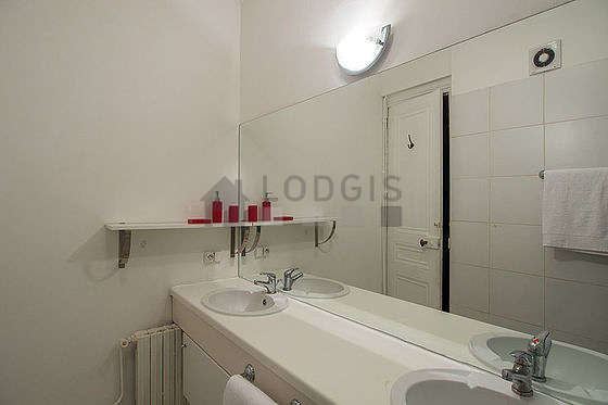 This apartment is equipped with a pleasant bathroom. This bathroom is furnished with all the equipment you need for a comfortable stay: bath towels, shelves, cupboard, bath tub, sink. The toilets are separated from the bathroom and located in an independant room.
