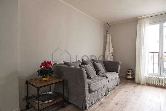 This apartment consists of a wonderful living room with wooden floor and its double-glazed windows and view on road. This quiet living room is furnished and equipped for a comfortable stay: tv, sofa, 1 armchair(s), storage space.