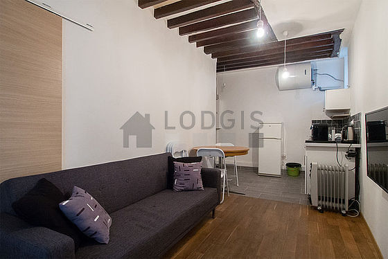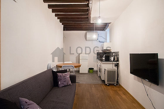 This apartment consists of a charming living room with wooden floor and its windows and view on courtyard. This quiet living room is furnished and equipped for a comfortable stay: tv, dining table, shelves, wooden beams, 4 chair(s)1 sofabed(s) of 140cm.