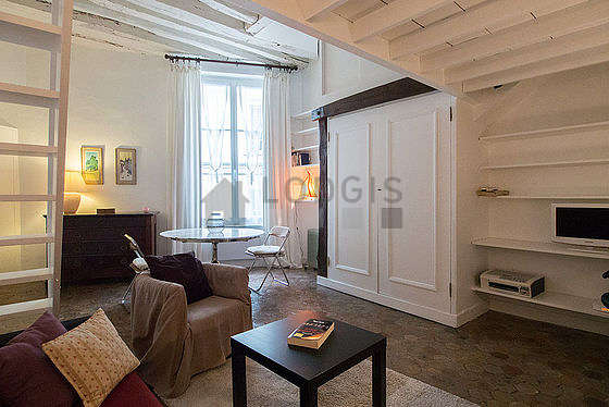 This apartment consists of a charming living room with a floor tiles floor and its double-glazed windows and view on road. This quiet living room is furnished and equipped for a comfortable stay: tv, 2 armchair(s), dining table, coffee table, desk, wardrobe, closet, cupboard, wooden beams, 3 chair(s)1 sofabed(s) of 140cm.