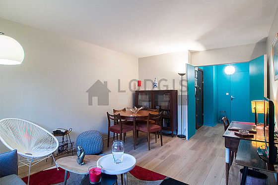Living roomThis apartment consists of a charming living room with wooden floor and its double-glazed windows and view on garden. This very quiet living room is furnished and equipped for a comfortable stay: tv, 1 armchair(s), dining table, coffee table, desk, shelves, sideboard, cupboard, 5 chair(s), stool1 sofabed(s) of 140cm.