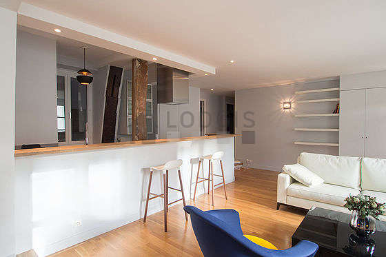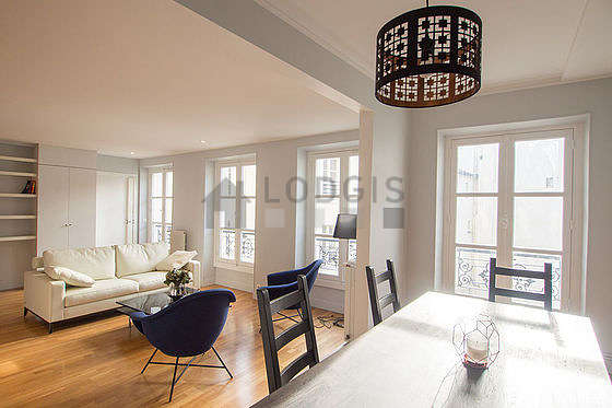 Living roomThis apartment consists of a beautiful living room with wooden floor and its double-glazed windows and view on courtyard. This very quiet living room is furnished and equipped for a comfortable stay: 1 armchair(s), dining table, coffee table, shelves.