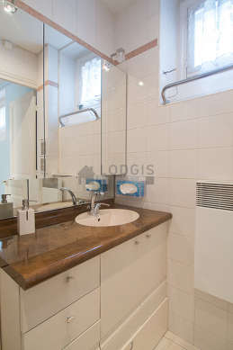 This apartment is equipped with a pleasant bathroom with windows. This bathroom is furnished with all the equipment you need for a comfortable stay: shelves, cupboard, bath tub, sink. The toilets are separated from the bathroom and located in an independant room.