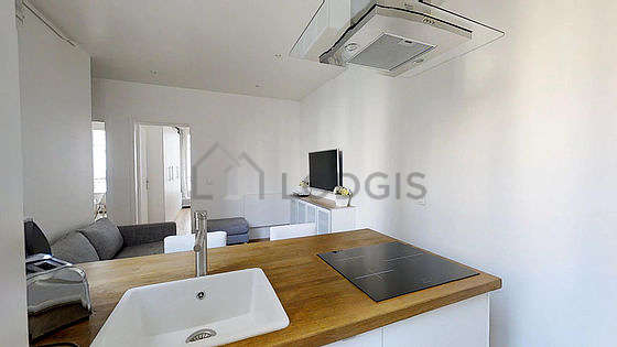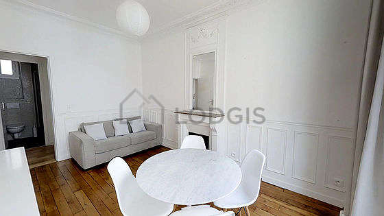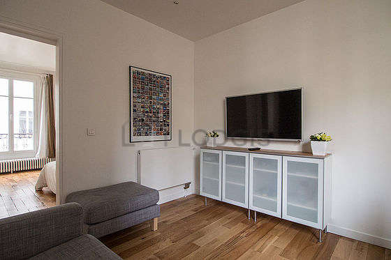 This apartment consists of a beautiful living room with wooden floor and its double-glazed windows and view on courtyard. This very quiet living room is furnished and equipped for a comfortable stay: tv, sofa, sideboard, cupboard, stool.