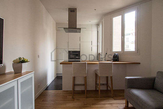 This apartment consists of a wonderful living room with wooden floor and its double-glazed windows and view on courtyard. This very quiet living room is furnished and equipped for a comfortable stay: tv, sofa, sideboard, cupboard, stool.