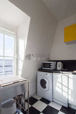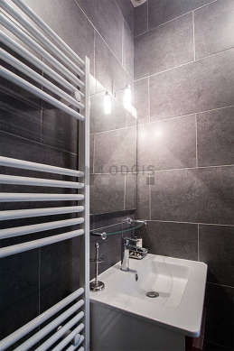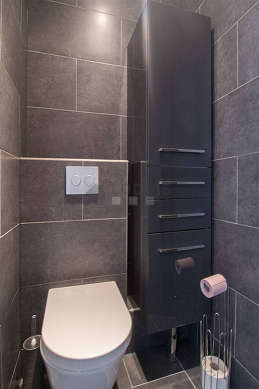This apartment is equipped with a pleasant bathroom. This bathroom is furnished with all the equipment you need for a comfortable stay: bath towels, shelves, cupboard, separate shower, hair-dryer, sink, towel drying radiator. The toilets are separated from the bathroom and located in an independant room.