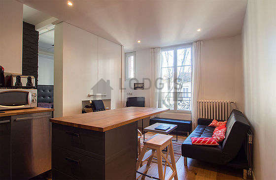 This apartment consists of a wonderful living room with wooden floor and its double-glazed windows and view on road. This quiet living room is furnished and equipped for a comfortable stay: tv, sofa, 1 armchair(s), dining table, coffee table, desk, shelves, stool1 sofabed(s) of 140cm.