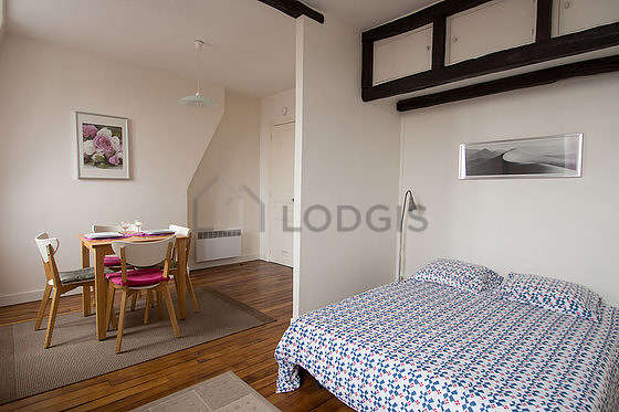 This apartment consists of a beautiful living room with wooden floor and its double-glazed windows and view on garden. This very quiet living room is furnished and equipped for a comfortable stay: tv, linen, quilt, dining table, wardrobe, shelves, cupboard, wooden beams, fireplace, 1 chair(s)1 bed(s) of 140cm.