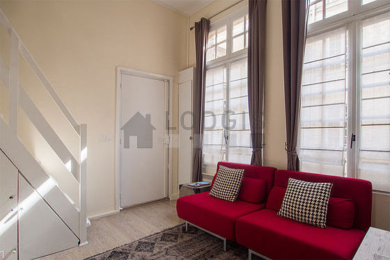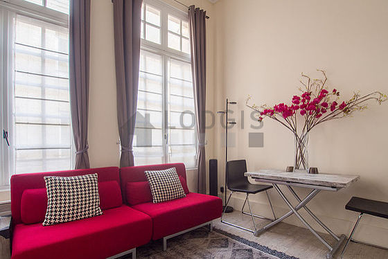 This apartment consists of a charming living room with wooden floor and its double-glazed windows and view on courtyard. This very quiet living room is furnished and equipped for a comfortable stay: linen, dining table, shelves, cupboard, 2 chair(s)1 sofabed(s) of 140cm.