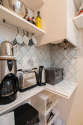 This apartment consists of beautiful kitchen with tile floor and all the essential equipment for your daily life: hob, refrigerator, oven, freezer, kettle, coffee-maker, shelves, cupboard, crockery.
