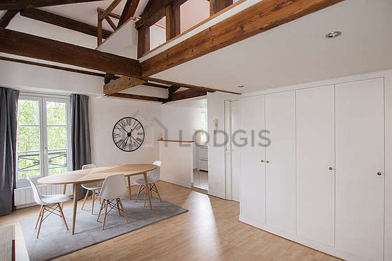 This apartment consists of a beautiful living room with wooden floor and its double-glazed windows and view on garden. This very quiet living room is furnished and equipped for a comfortable stay: tv, dining table, coffee table, wardrobe, cupboard, wooden beams, 1 chair(s)1 sofabed(s) of 160cm.