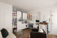 This apartment consists of a wonderful living room with wooden floor and its double-glazed windows and view on courtyard. This very quiet living room is furnished and equipped for a comfortable stay: tv, linen, quilt, sofa, 1 armchair(s), dining table, coffee table, cupboard.