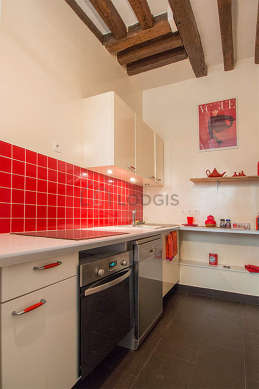 In order to share your meals in a convivial atmosphere during your stay parisian, this apartment offers a pleasant dining room that can welcome up to 4 guests thanks to its dining table, wooden beams, 4 chair(s).